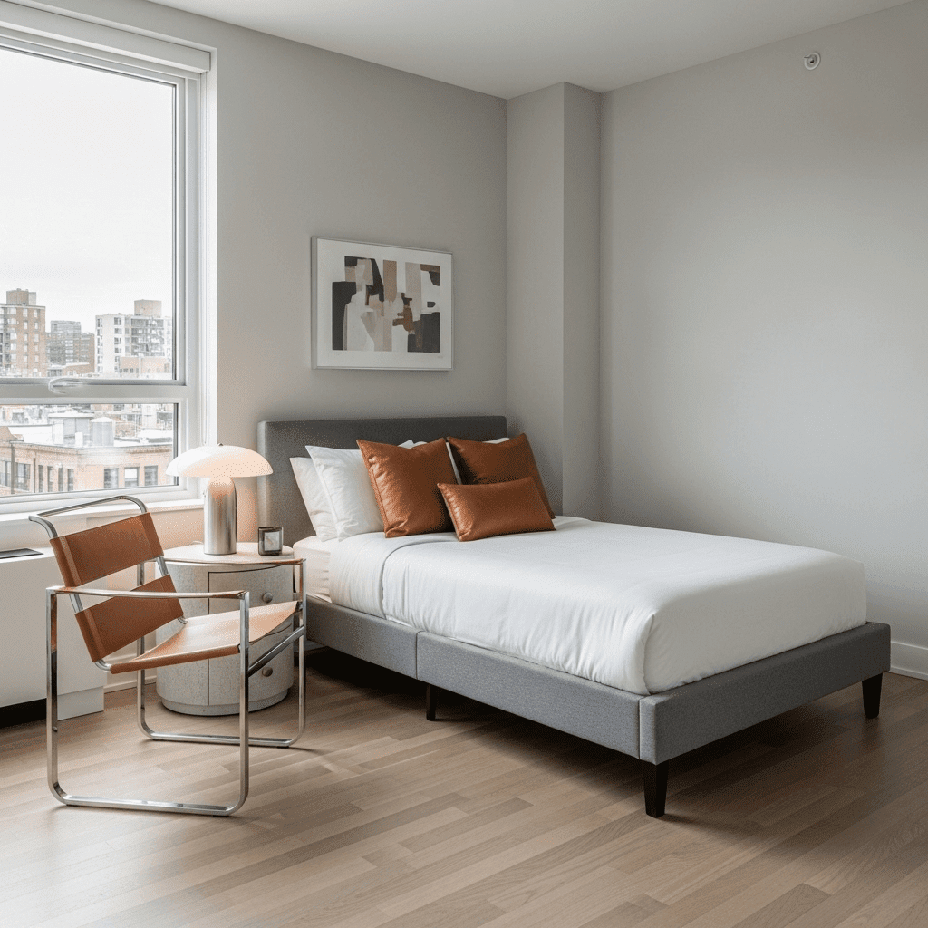 Modern bedroom ideas for small rooms men mix “hard” materials for a premium feel. A cognac leather pillow or a chrome chair adds a sense of luxury that makes a small room feel like a high-end designer suite.
