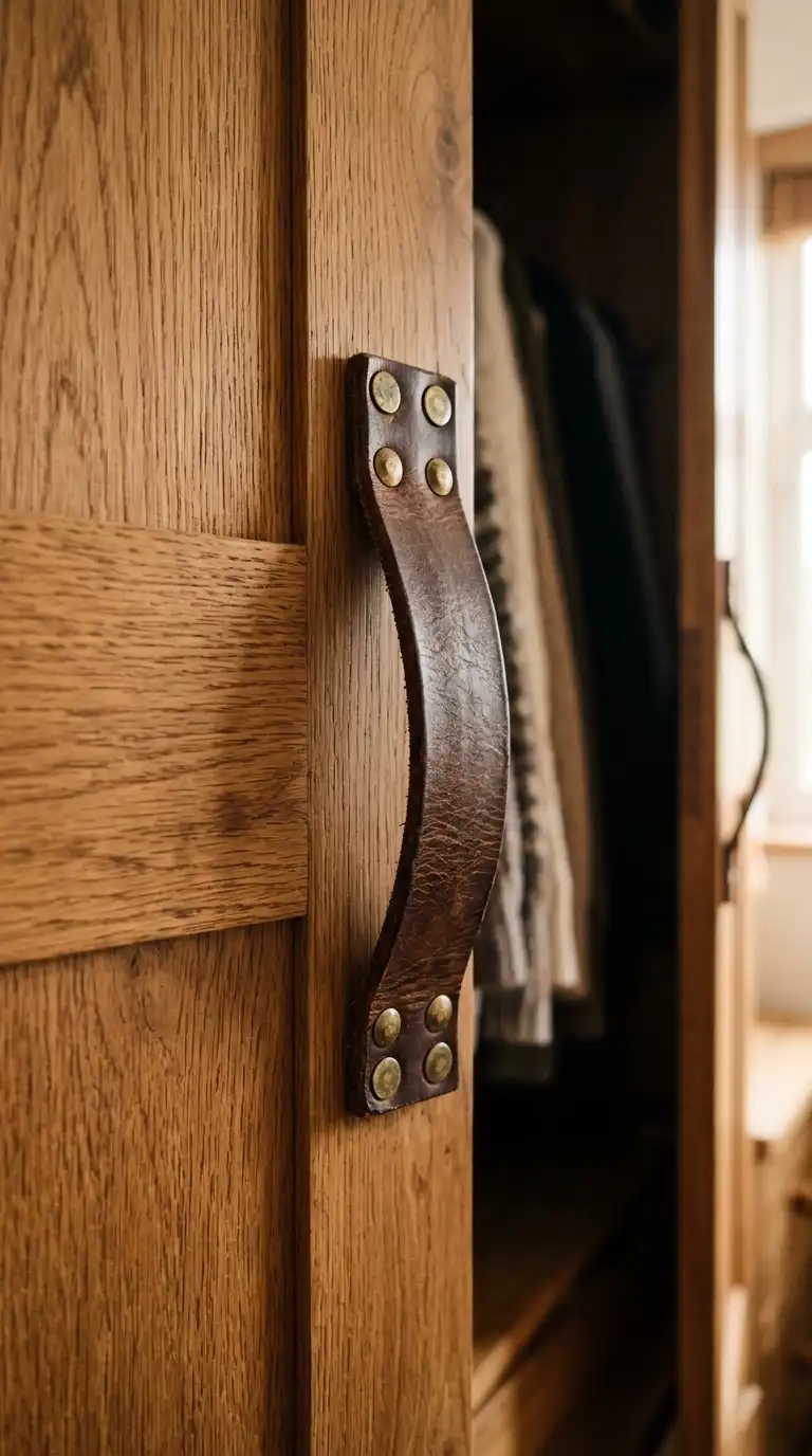 Leather strap handles add a rustic, handcrafted element to wardrobe doors. The straps can be attached with rivets or ties, creating a relaxed, organic look. This style suits farmhouse, bohemian, and Scandinavian interiors.