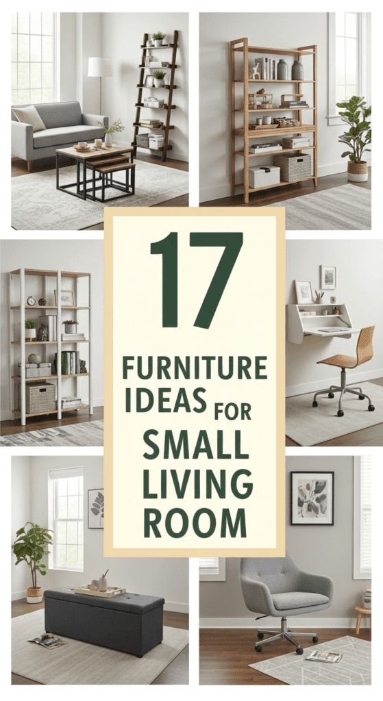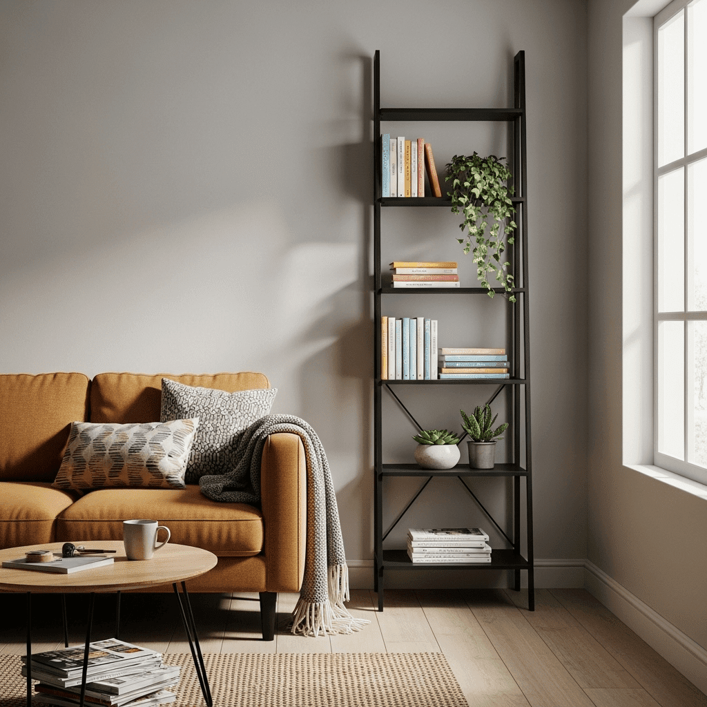 Furniture ideas for small living room displays utilize leaning ladder shelves. Their narrow depth and vertical height draw the eye upward, making the most of the wall without protruding into the walking path.