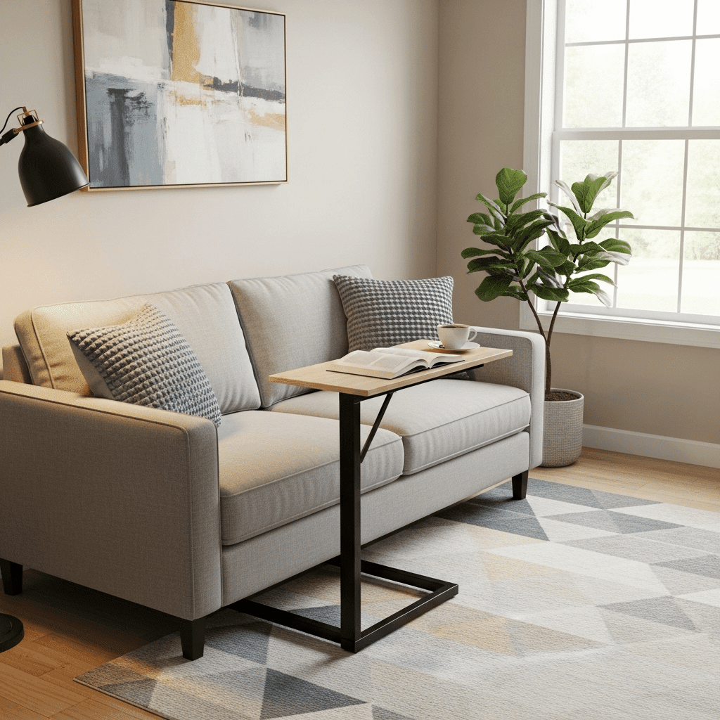 Furniture ideas for small living room versatility use C-tables that slide over the arm of the sofa. This provides a stable workspace or snack tray that requires zero dedicated floor area.