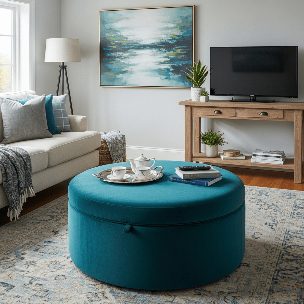 Furniture ideas for small living room organization replace a standard coffee table with a storage ottoman. This multi-use piece acts as a footrest, extra seating, and a hidden bin for bulky blankets.