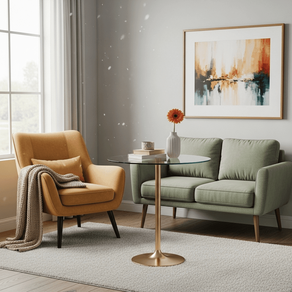 Furniture ideas for small living room corners often use a small glass-top pedestal table. The glass keeps the corner feeling airy, while the pedestal base takes up less floor space than four traditional legs.