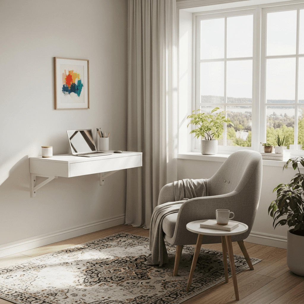 Furniture ideas for small living room offices include a fold-down or floating desk. This allows the living room to serve as a workspace during the day and disappear at night to maintain a relaxing atmosphere.