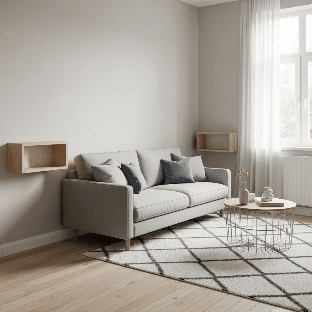 Furniture ideas for small living room layouts can replace floor-standing end tables with wall-mounted shelves. Placing a small shelf at sofa-arm height keeps the floor completely clear and creates a minimalist, custom look.