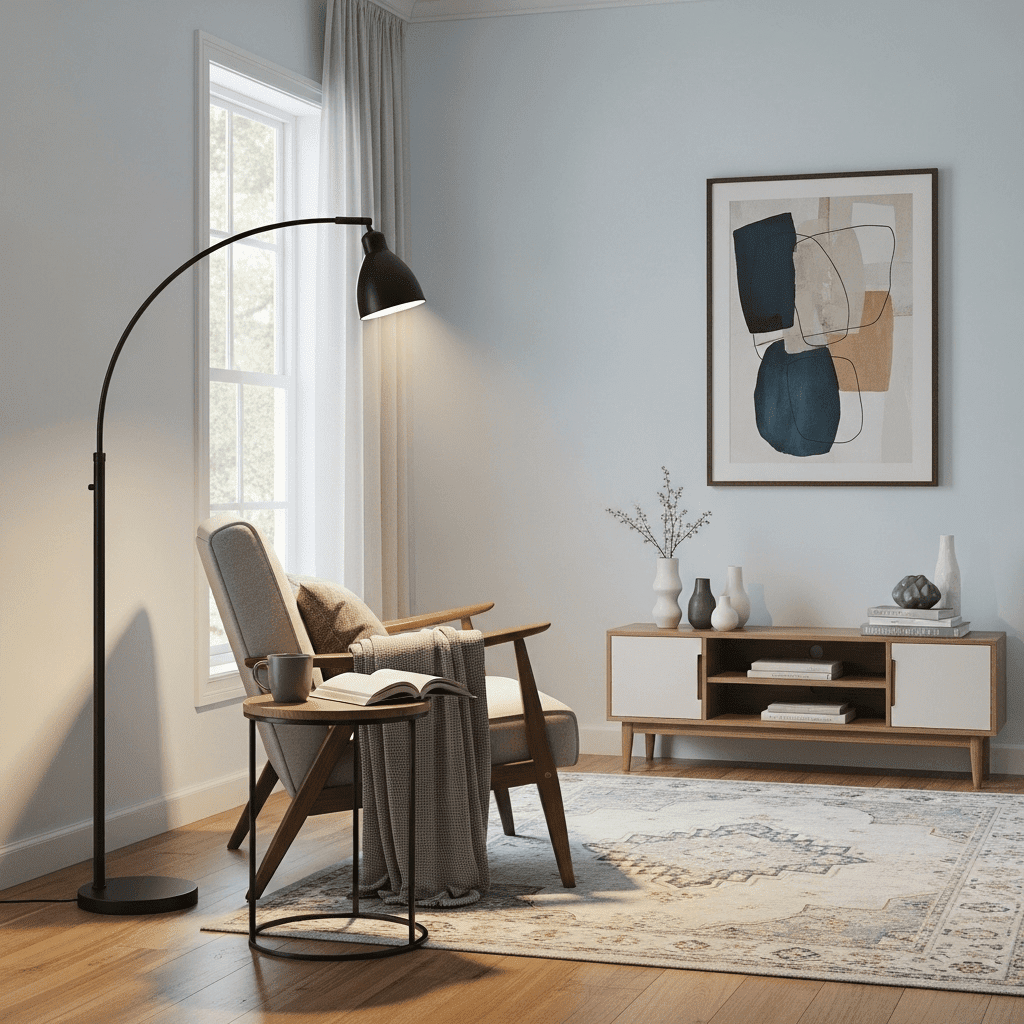 Furniture ideas for small living room lighting utilize lamps with a “pharmacy” style or a very thin base. This provides necessary illumination without occupying the surface of a side table.