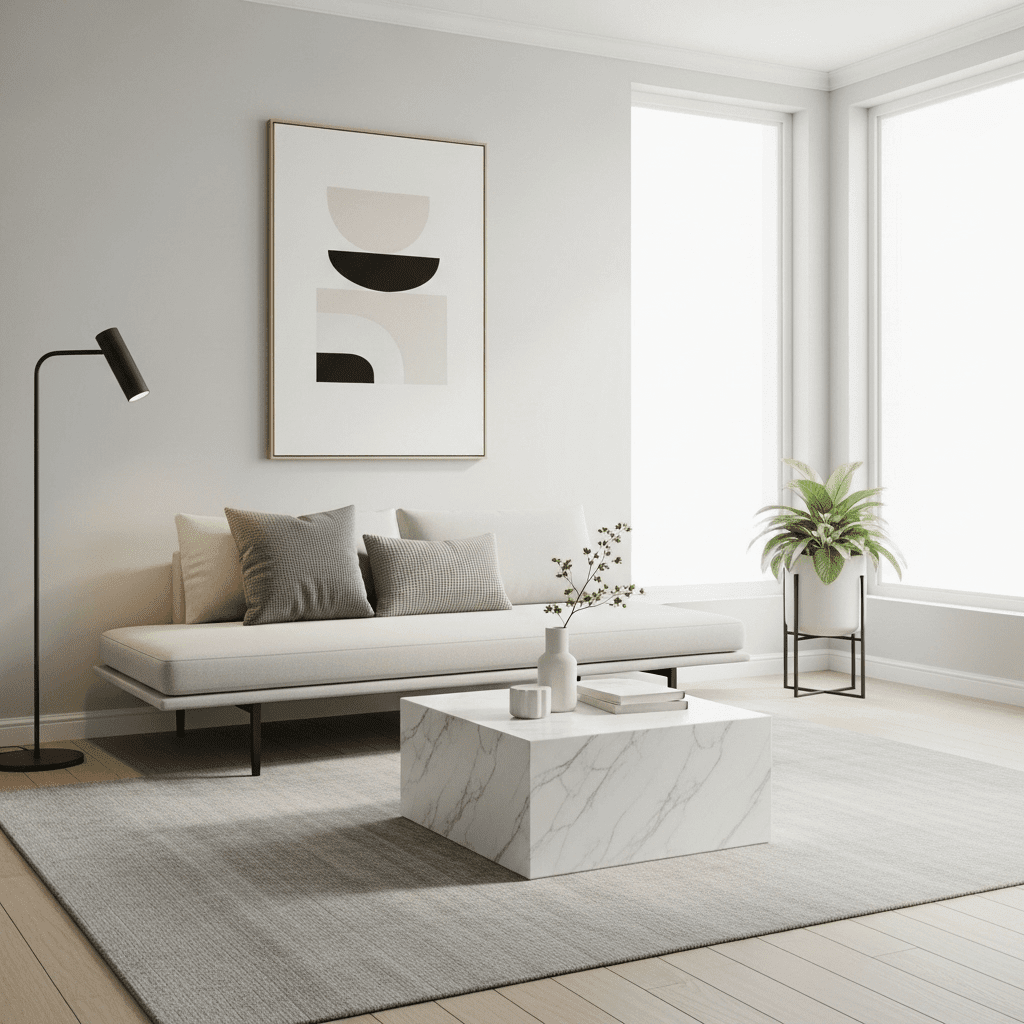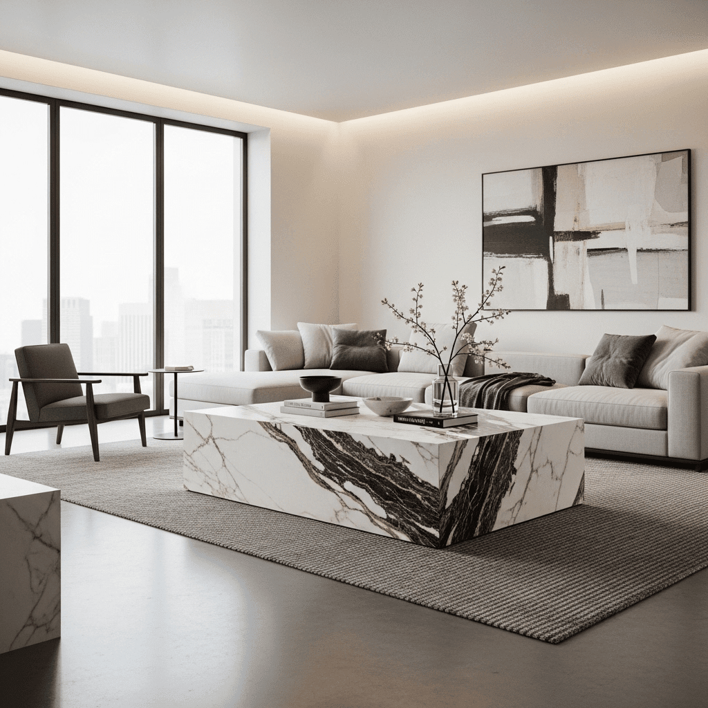 Marble living room center table ideas often feature a low-slung, solid square block. The lack of legs emphasizes the weight and permanence of the stone, creating a grounding focal point in a minimalist room.