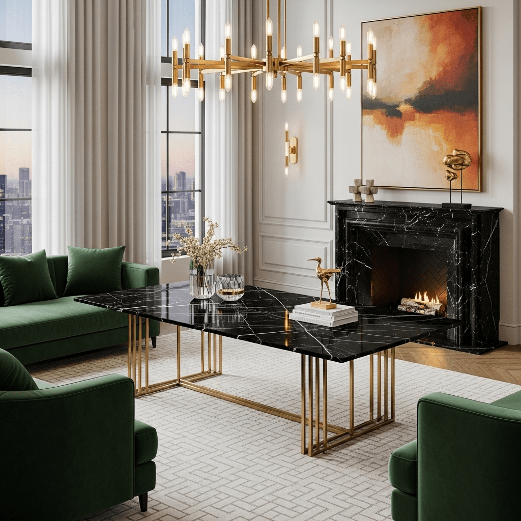 Marble living room center table ideas can lean into high-contrast luxury. Black Nero Marquina marble with striking white veins is enhanced by thin brass or gold metal insets that run through the stone like a grid.