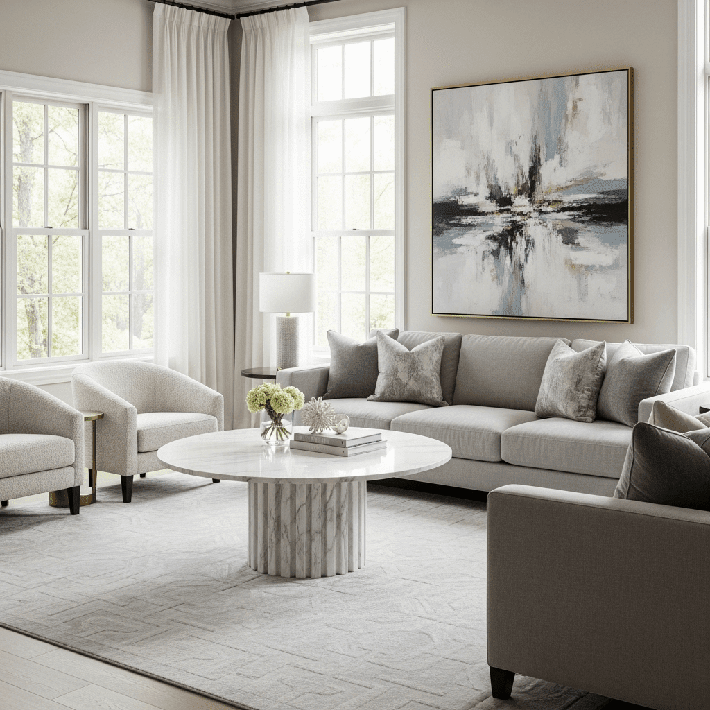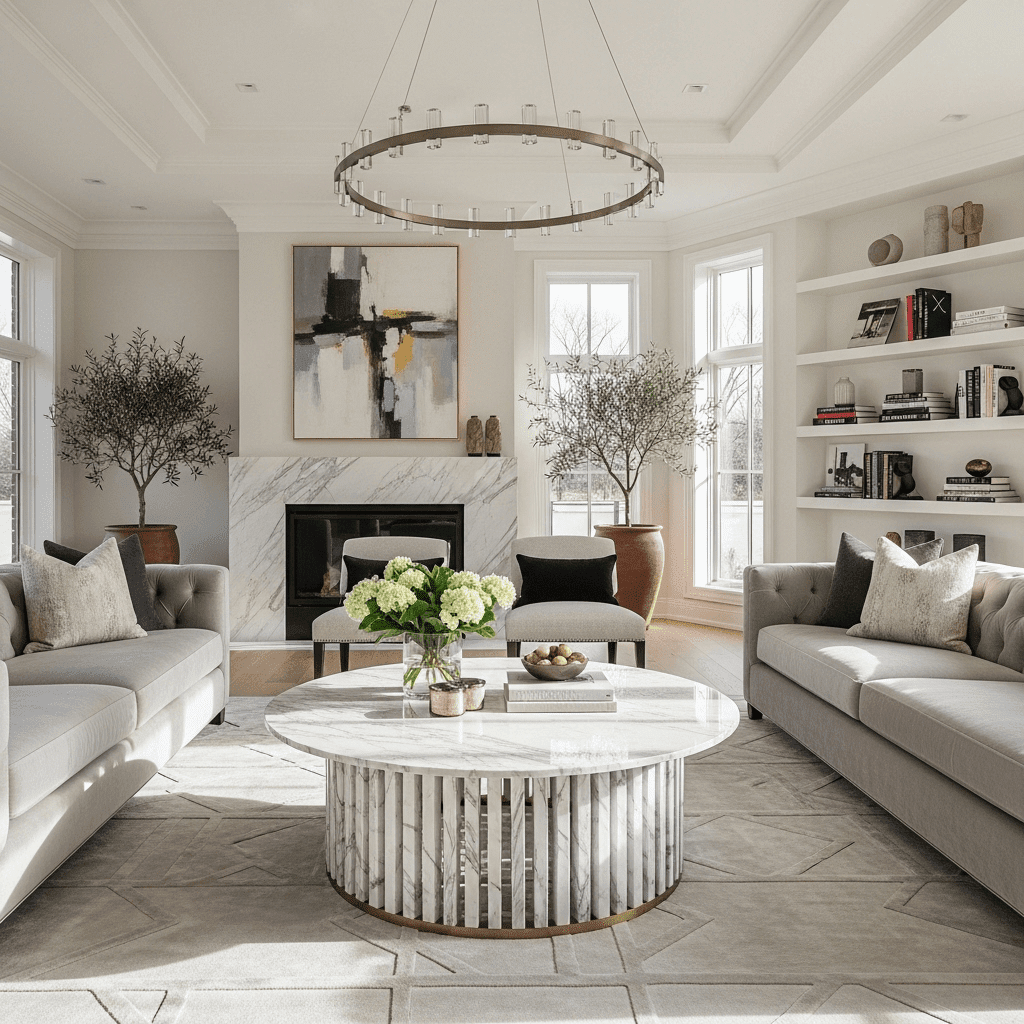 Marble living room center table ideas utilize architectural textures. A round marble top supported by a thick, fluted marble base adds vertical rhythm and a Greco-Roman influence to a modern space.