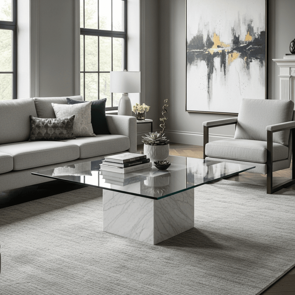 Marble living room center table ideas can be layered. Placing a wide glass top over a smaller, solid marble plinth base creates a “floating” effect that showcases the stone without taking up too much visual floor space.