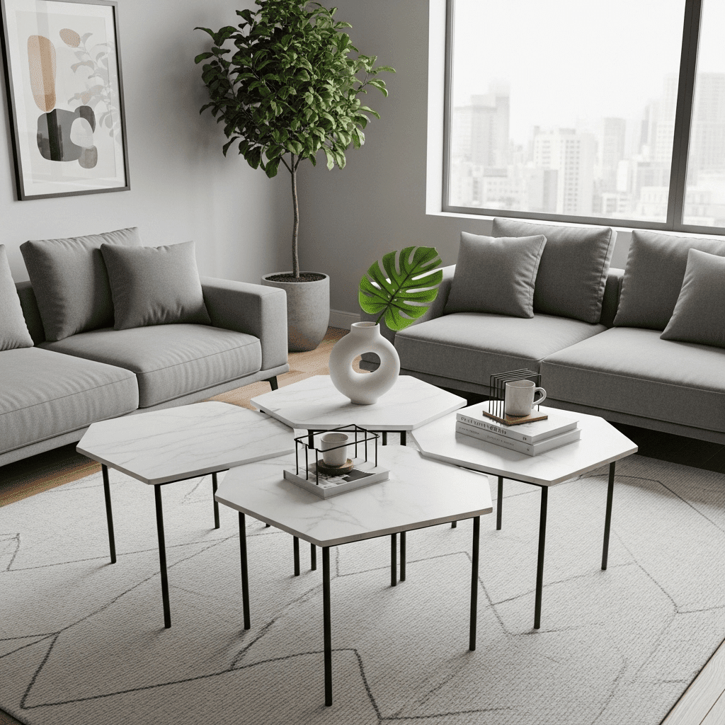 Marble living room center table ideas utilize geometric shapes to create modularity. A set of three hexagonal marble-topped tables can be clustered to form a large honeycomb pattern or separated for individual use.