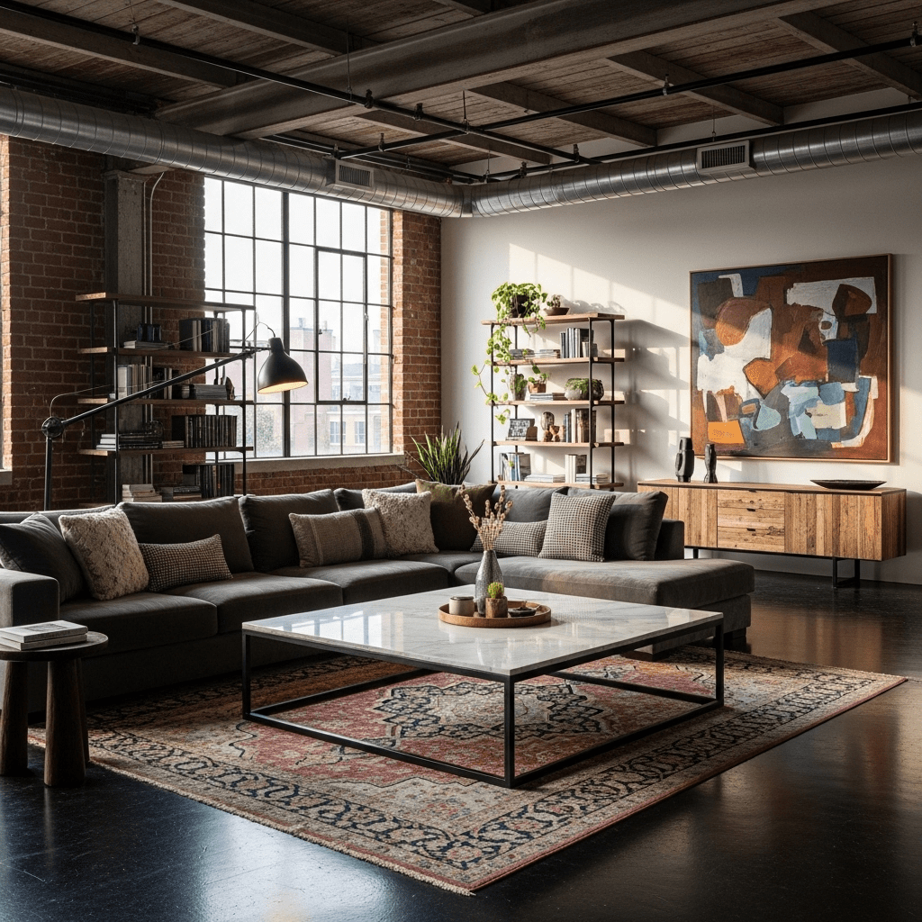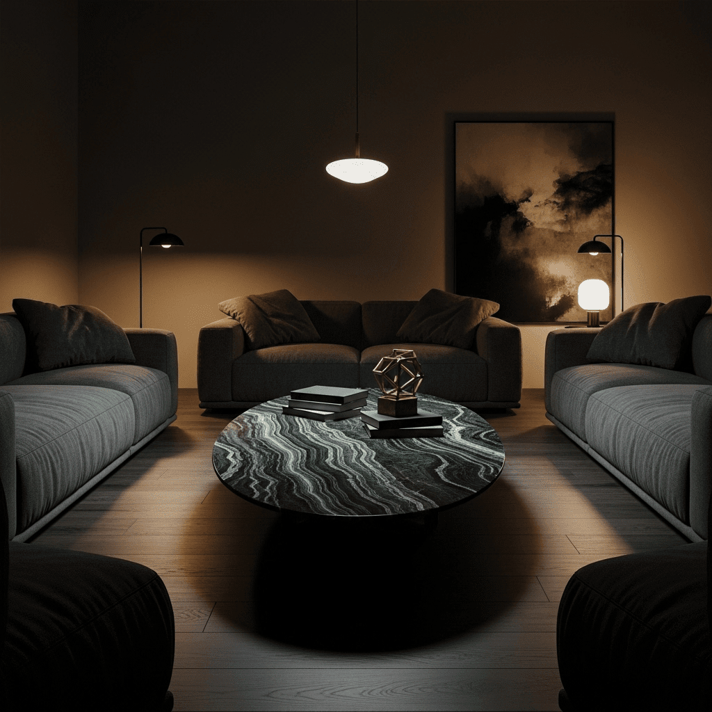 Marble living room center table ideas can take on a rugged look. Framing a heavy marble slab in chunky, matte black industrial steel provides a “loft-style” aesthetic that is durable and masculine.