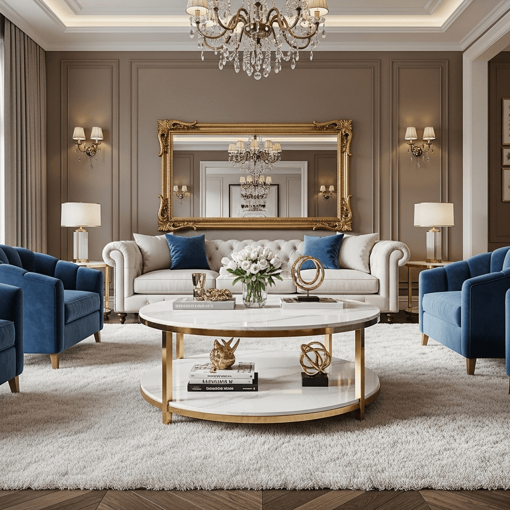 Marble living room center table ideas maximize functionality with multiple levels. A top tier of white marble paired with a lower tier of brushed brass offers a glamorous storage solution for books and magazines.