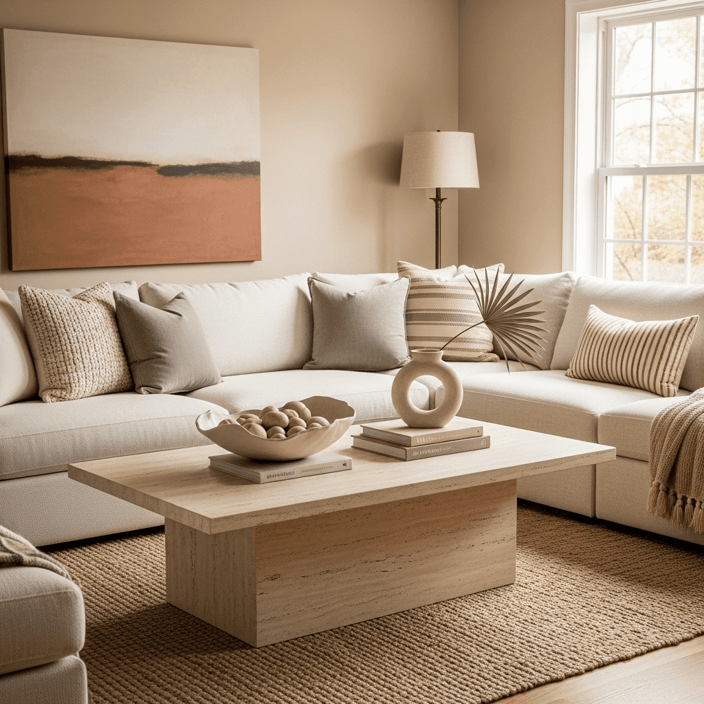 Marble living room center table ideas often include travertine for its porous, earthy texture. Leaving the edges “raw” and unpolished adds a wabi-sabi element to an otherwise polished living room.