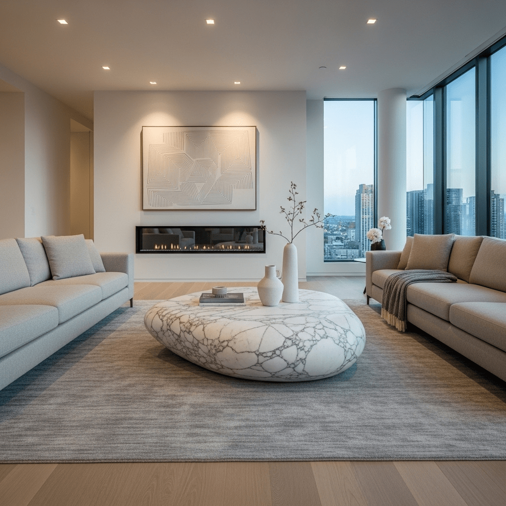 Marble living room center table ideas embrace organic shapes. An Arabescato marble table carved into a soft, irregular pebble shape breaks up the straight lines of a traditional sofa arrangement.