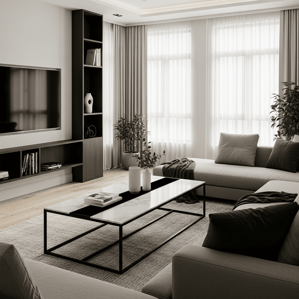 Marble living room center table ideas can be highly functional. A table where the marble top is slightly recessed into a metal or wood frame creates a “tray” effect, preventing items from sliding off and adding depth to the design.