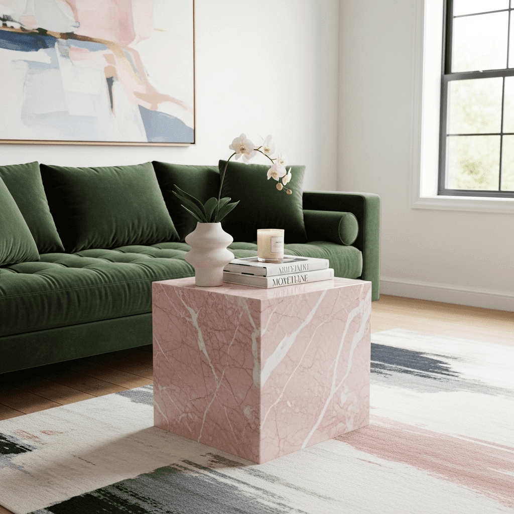 Marble living room center table ideas can be soft and feminine. Rose-colored marble provides a gentle pop of color that works beautifully in rooms with velvet upholstery and gold accents.