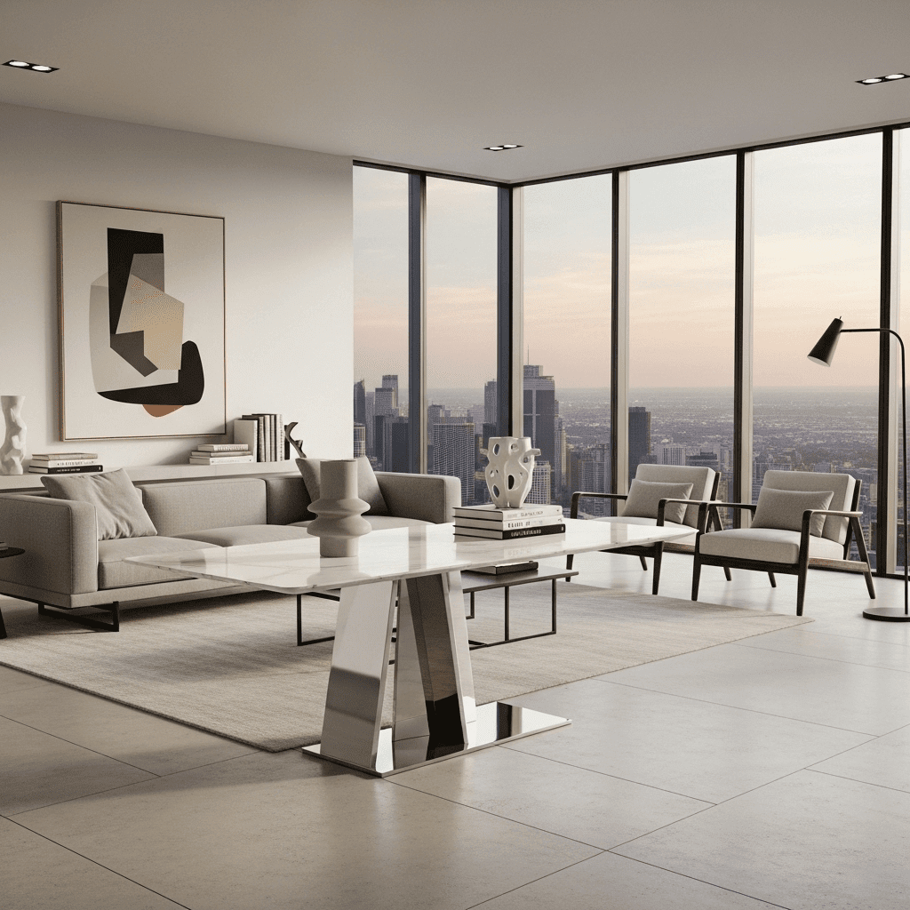 Marble living room center table ideas experiment with balance. A cantilevered marble slab that appears to hang off a chrome support frame offers a futuristic, high-design silhouette.