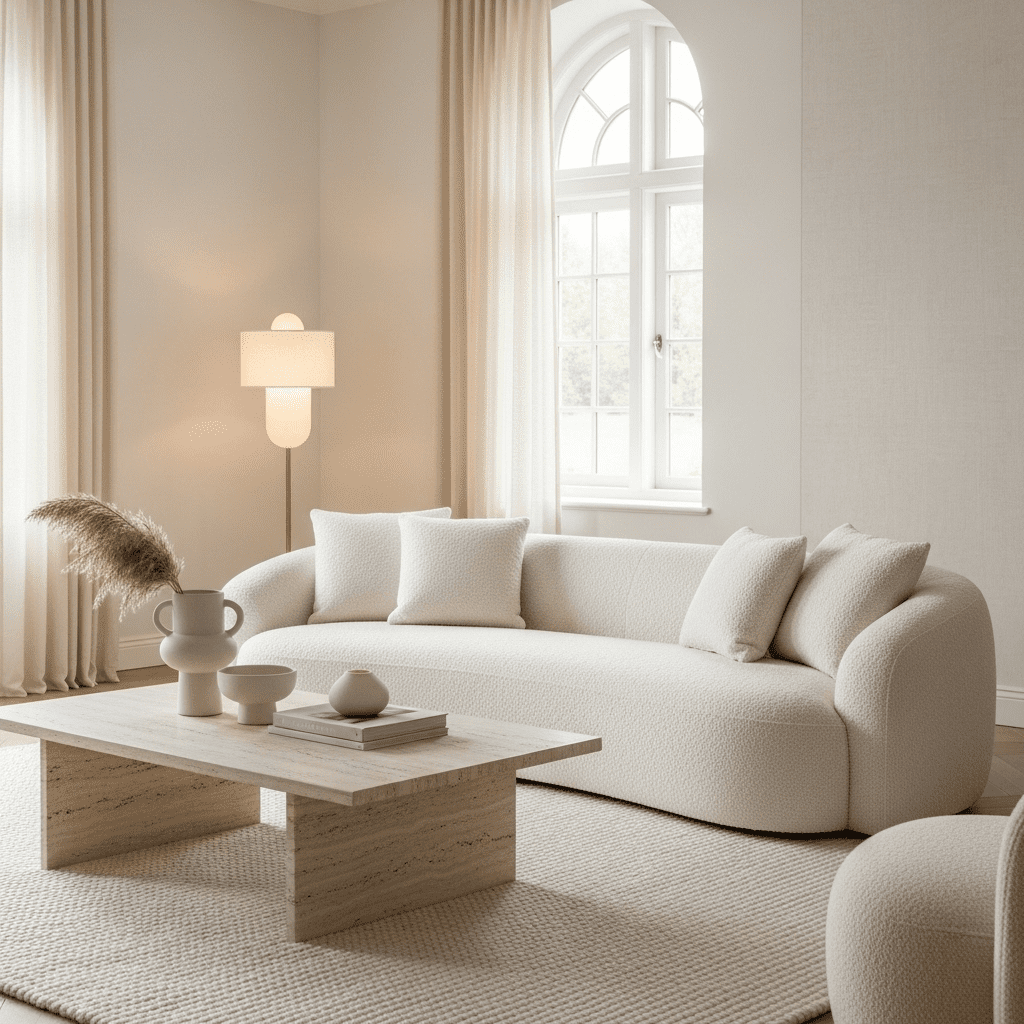 A masterclass in subtle layering, using various shades of cream, ivory, and off-white. The elegance comes from the mix of textures: a bouclé sofa, silk curtains, and a matte stone coffee table.