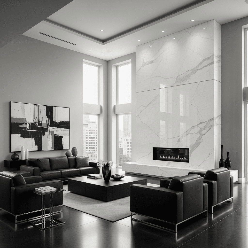 Centering the room around a floor-to-ceiling fireplace clad in a single slab of dramatic Calacatta or Nero Marquina marble.