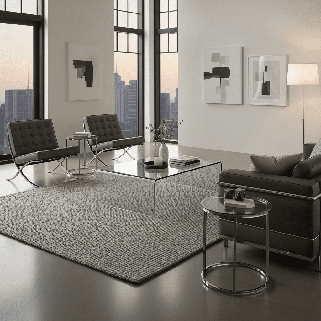 Embracing the “transparency” trend with glass coffee tables and chrome-framed chairs. This makes the room feel light, airy, and distinctly futuristic.