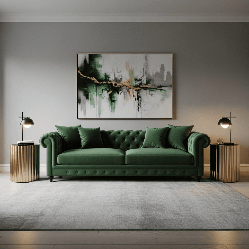 An otherwise neutral, modern room anchored by a single piece of furniture in a rich jewel tone like emerald green, royal blue, or deep plum.
