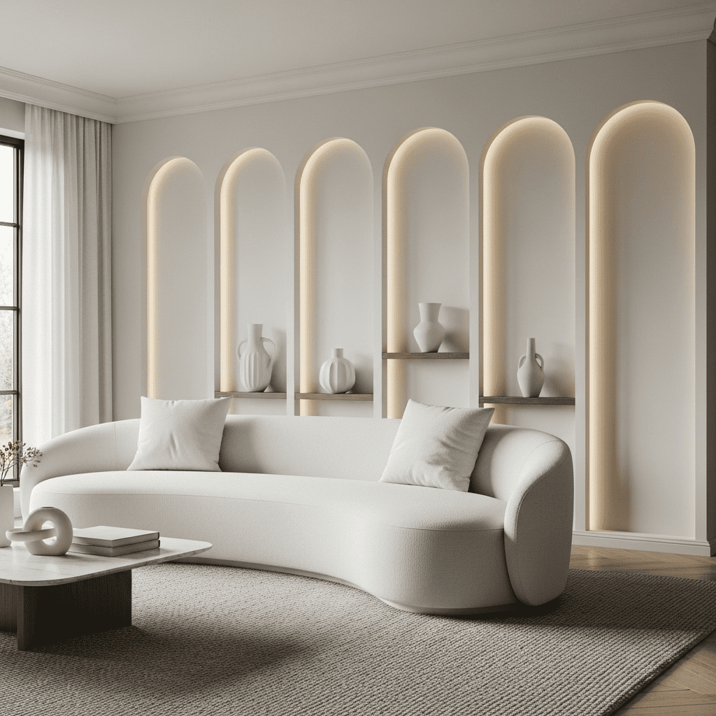 Incorporating soft curves through arched doorways or built-in wall niches to soften the sharp lines of modern furniture.