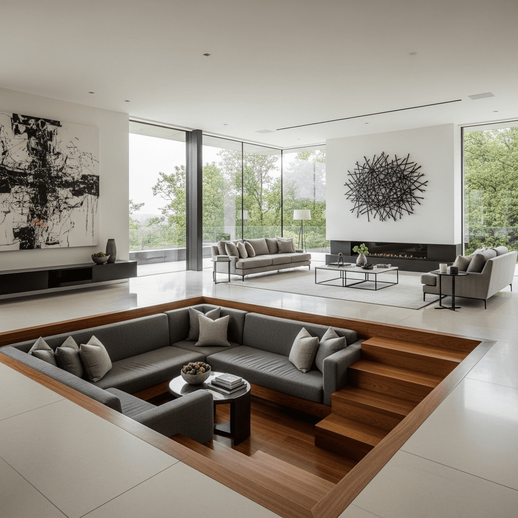 A contemporary take on the 1970s conversation pit, using clean lines and high-end fabrics to create a dedicated social zone that feels exclusive.