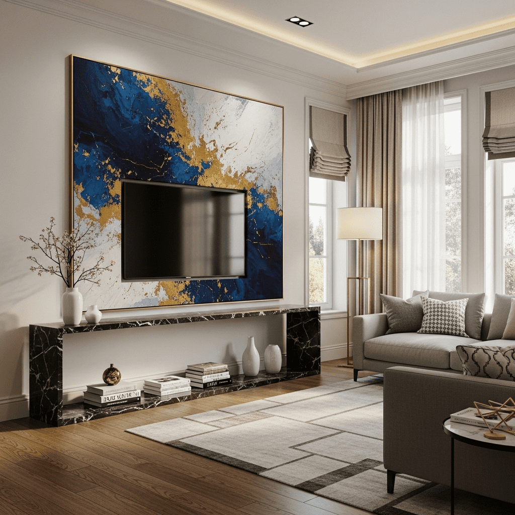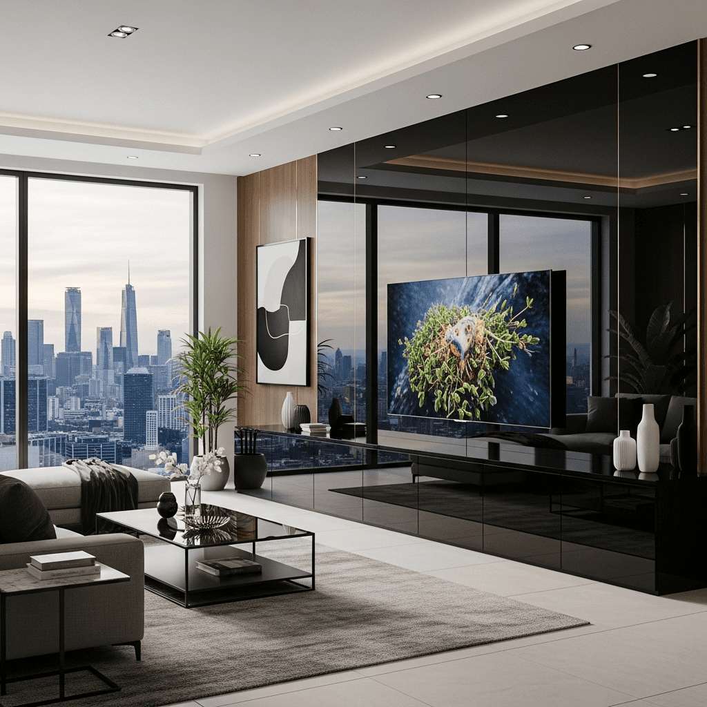 A design where the TV is hidden behind art or integrated into a dark mirrored wall so the room remains focused on conversation and aesthetics.