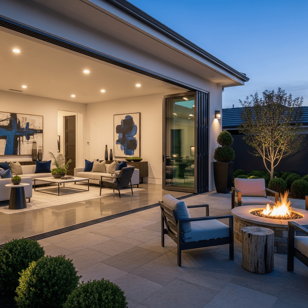Utilizing massive floor-to-ceiling glass sliders that disappear into the walls, making the patio and living room feel like one continuous elegant space.