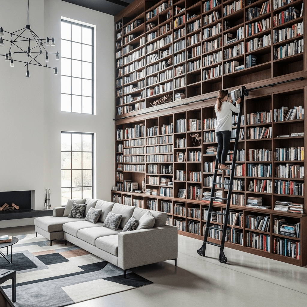 Taking advantage of vertical space with a two-story wall of books, a minimalist ladder, and oversized windows.