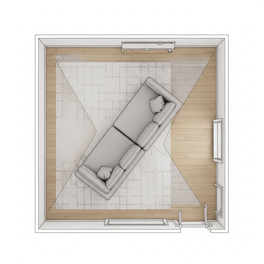 Angle your main seating at a 45-degree angle to the walls. This unexpected layout can make a narrow room feel wider by drawing the eye along the longest dimension of the space.