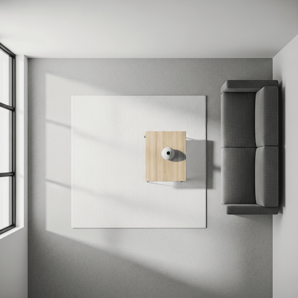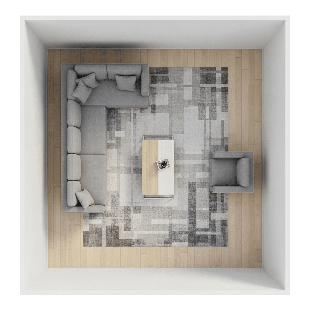 Use a large square rug to define the space and keep only a sofa and a low-profile coffee table on it. The simplicity of the square layout keeps the room feeling “tidy.”