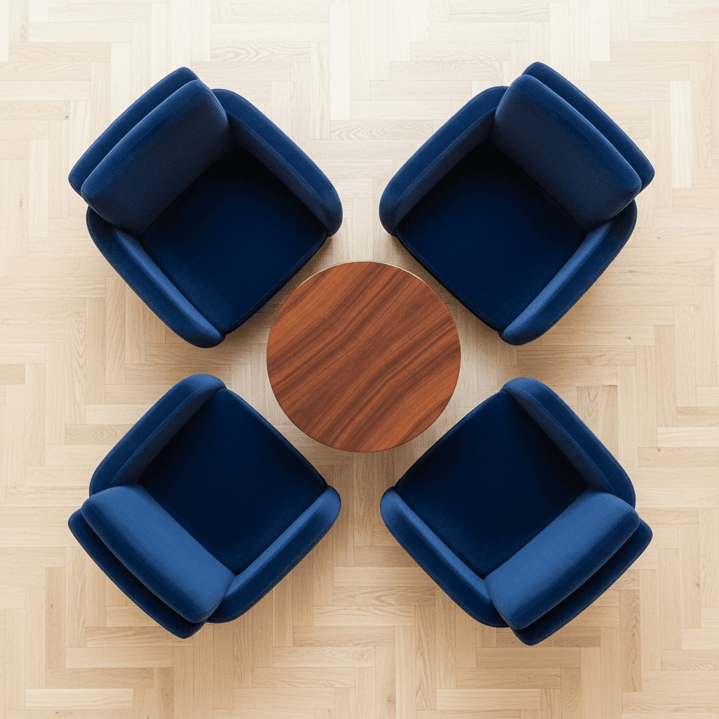 Arrange four armchairs around a circular coffee table. This layout eliminates the “heavy” look of a large sofa and makes a small room feel like a high-end hotel lounge.