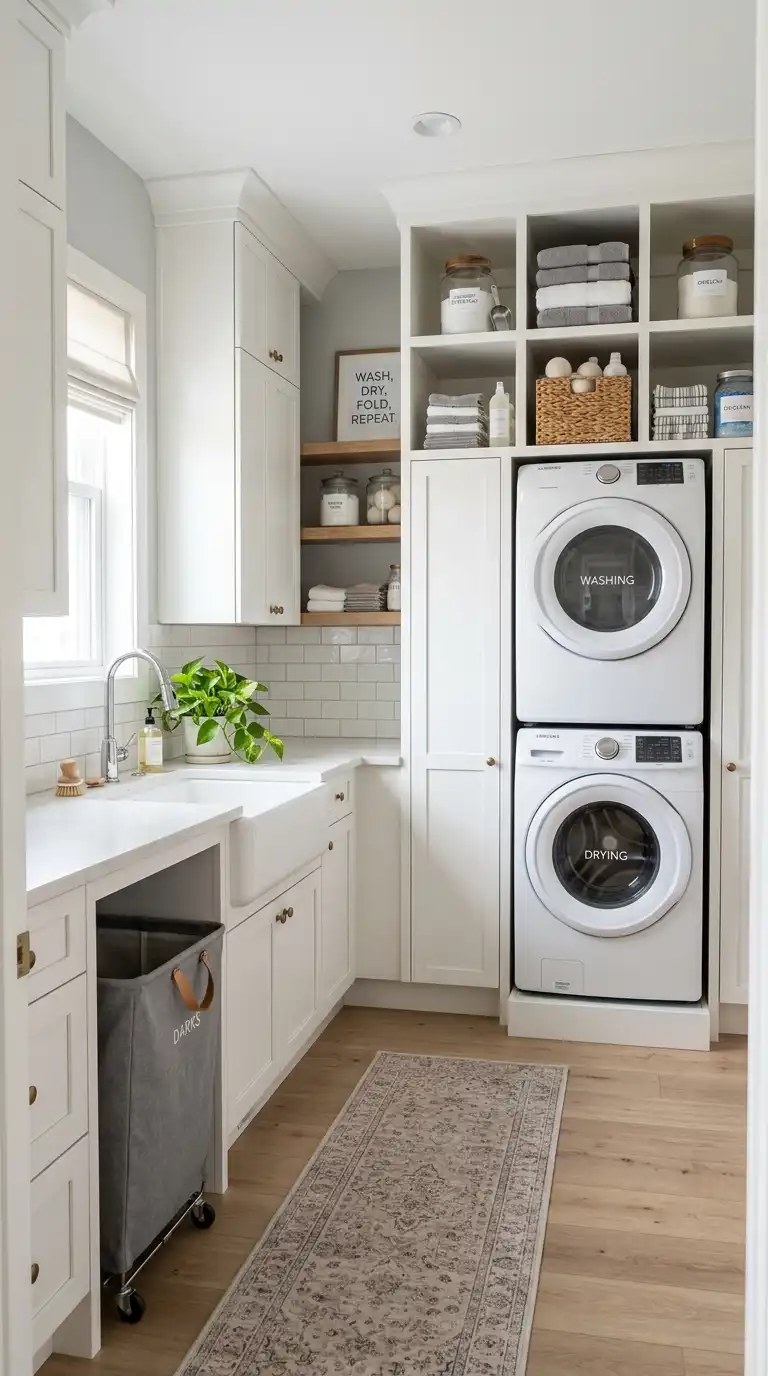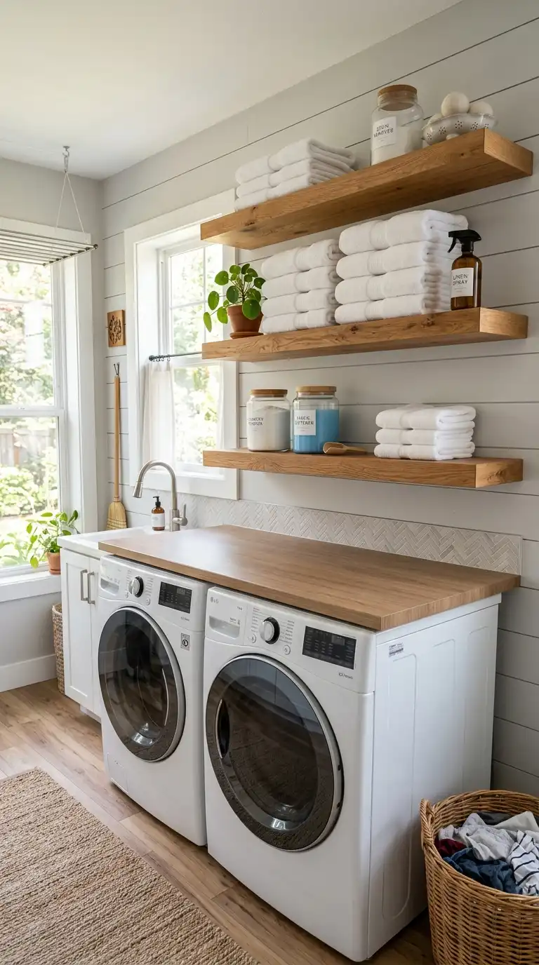 Floating wooden shelves add warmth and a rustic touch to any laundry room. Use solid wood or high-quality plywood. Stain or paint them to match your cabinets. Mount them above the washer and dryer or along an empty wall. Use them to display detergent in glass jars, folded towels, and a small plant. The floating design keeps the look clean and modern.