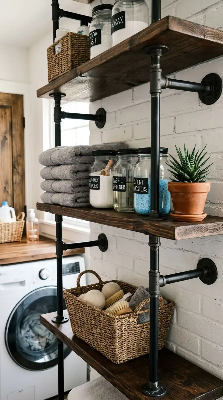 For a modern industrial look, use black iron pipes and fittings to create shelves. Mount flanges to the wall, attach pipes, and lay wooden boards across them. The combination of dark metal and warm wood adds character. Use these shelves to hold detergent, fabric softener, and decorative items.
