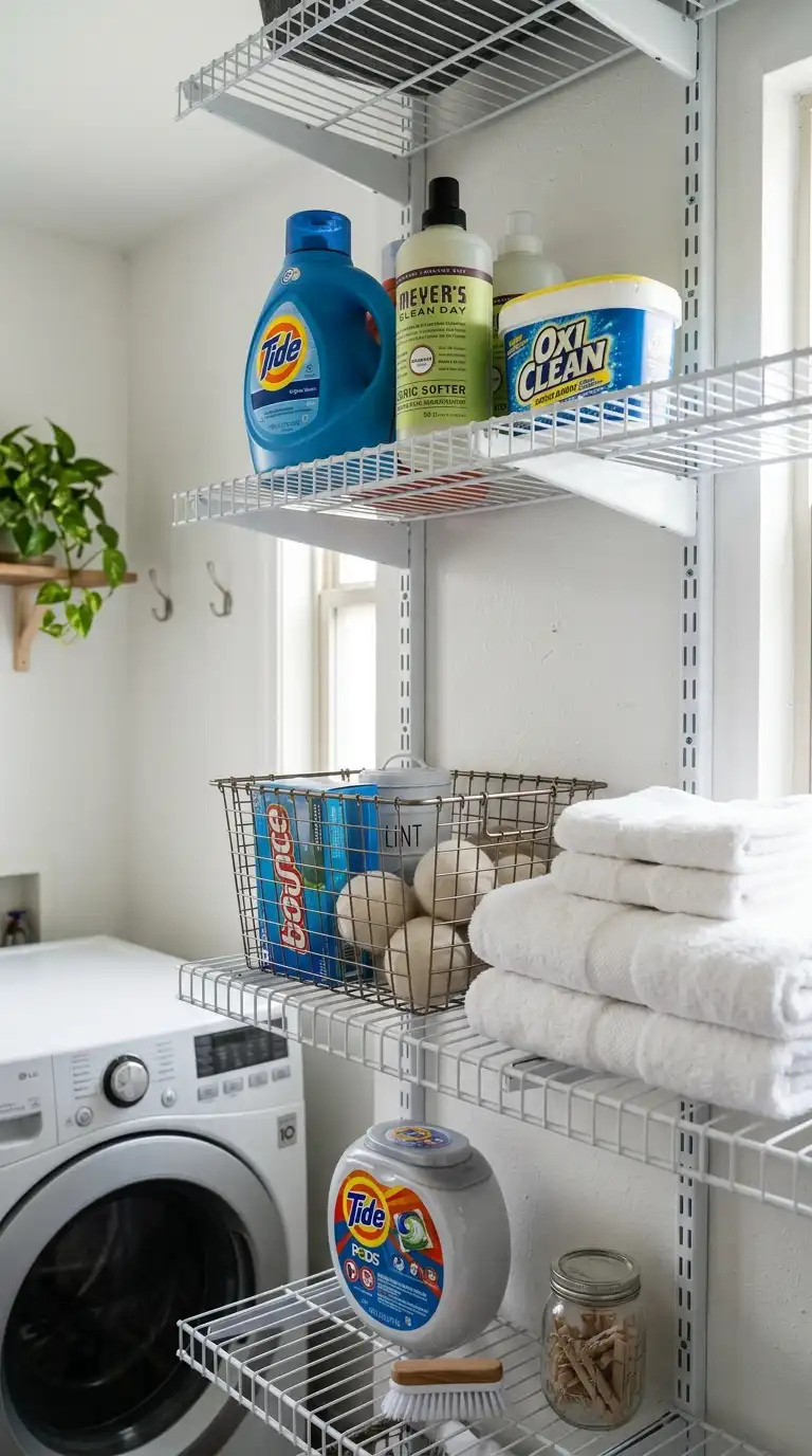 Wire shelving is affordable, durable, and allows you to see supplies easily. Use chrome or white-coated wire shelves. Install them on adjustable tracks so you can change the height as needed. Wire shelves are perfect for storing laundry baskets, detergent bottles, and dryer sheets. The open design prevents dust buildup.