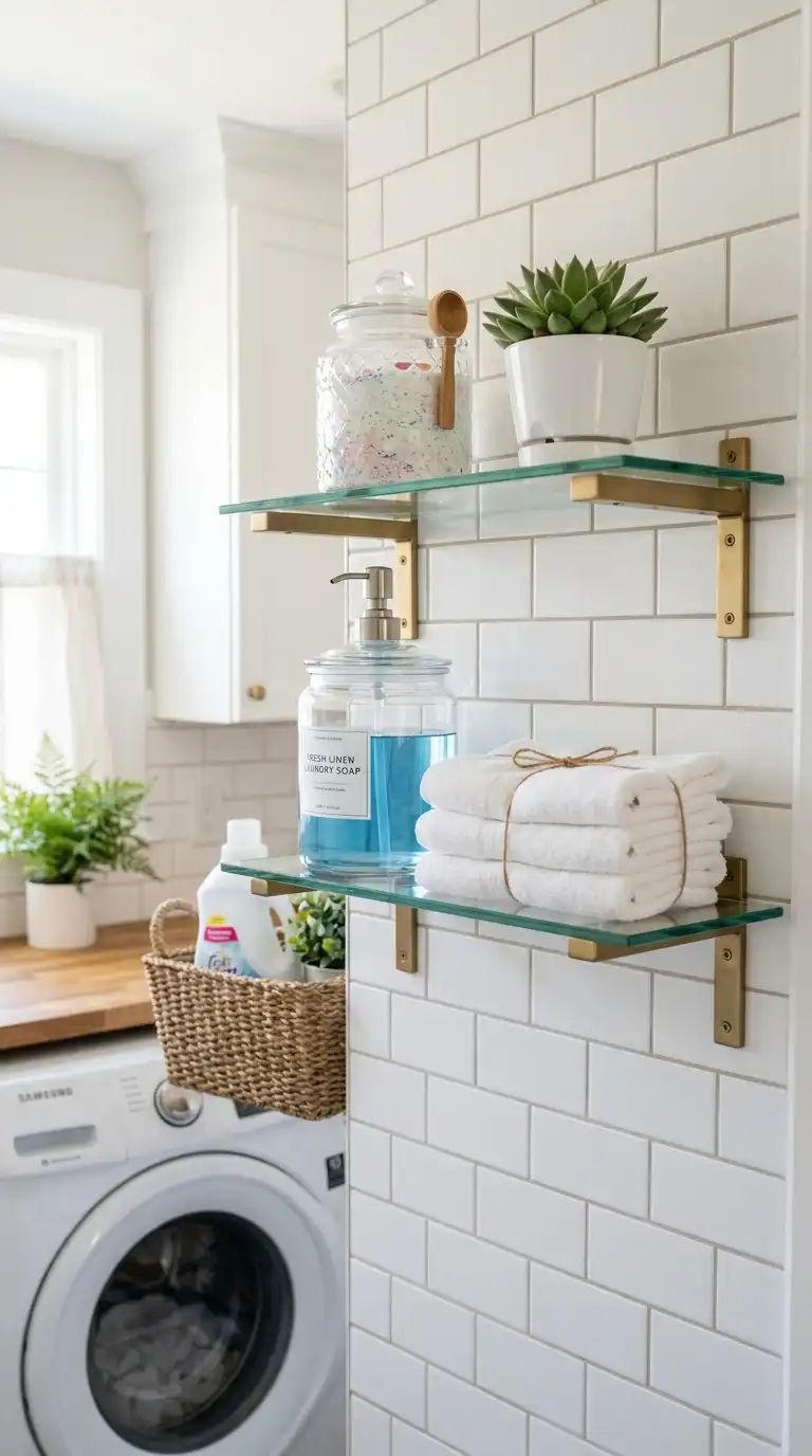 Glass shelves add a modern, airy feel to a laundry room. Use tempered glass for safety and durability. Mount them with decorative metal brackets in brass, black, or chrome. Glass shelves are perfect for displaying pretty glass jars or small plants. They keep the space feeling open and uncluttered.