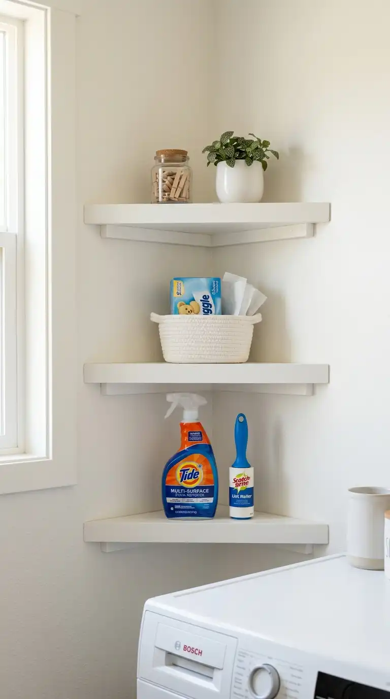 Use corner space that might otherwise go unused. Install floating corner shelves or a corner shelving unit. Use them to store smaller items like stain removers, lint rollers, and dryer sheets. Corner shelves keep these essentials within reach without taking up prime wall space.
