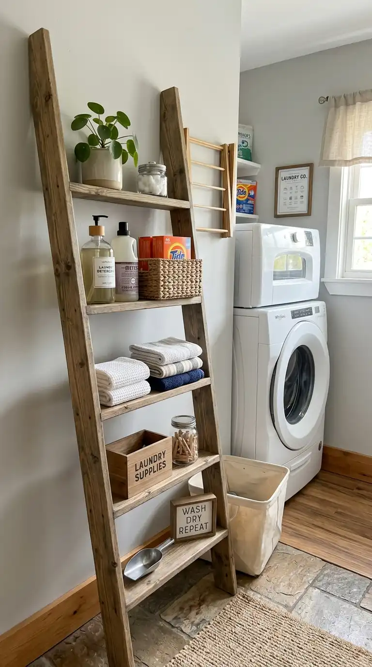 A leaning ladder shelf is a stylish, space-saving option. It leans against the wall and takes up minimal floor space. Use the wide shelves for detergent bottles and the narrower shelves for smaller items. Ladder shelves are easy to move and work well in rental properties.