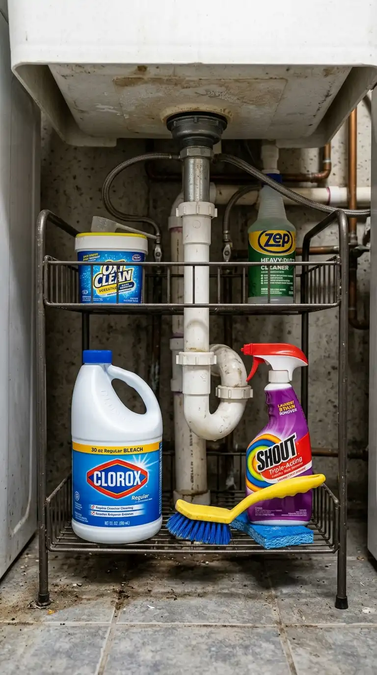 Make use of the space under your utility sink. Install a small two-tier shelf that fits around the plumbing pipes. Use it to store cleaning supplies, stain removers, and sponges. A slide-out under-sink organizer can also work well.