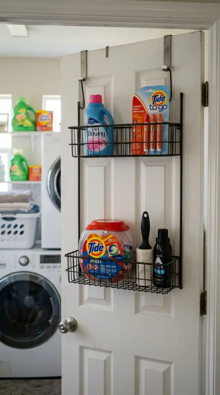 Use the back of the laundry room door for extra storage. Hang an over-the-door shelf unit with multiple tiers. Use it to hold detergent pods, dryer sheets, and small supplies. This is an excellent solution for very small laundry rooms with no wall space.