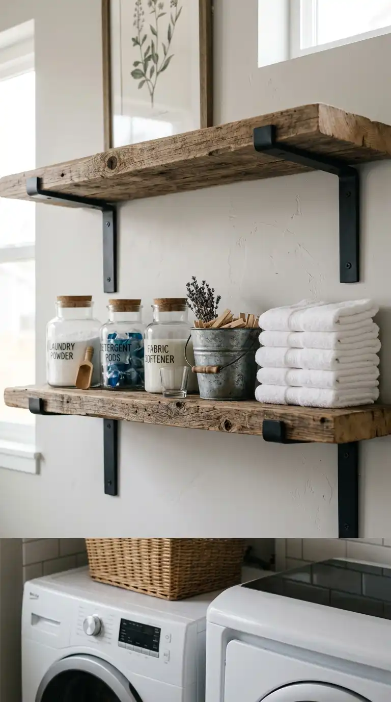 Combine rustic metal brackets with reclaimed wood for a farmhouse look. Use heavy-duty brackets in black or aged bronze. Use an old barn wood plank or reclaimed pine for the shelf. This style adds character and warmth to any laundry room.