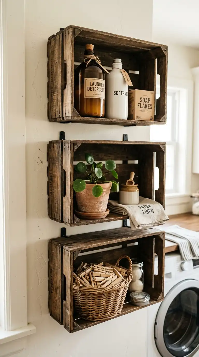 Repurpose wooden crates as unique, rustic shelves. Attach crates to the wall horizontally or vertically. Use them to store detergent, fabric softener, and other supplies. The open front keeps items visible and accessible. Stack multiple crates to create a larger shelving unit.