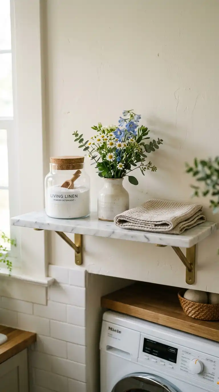 For a touch of luxury, use a marble shelf with brass brackets. The combination of white marble and warm brass is elegant and sophisticated. Use the shelf to display pretty glass jars or a small vase of fresh flowers. This is perfect for a luxury laundry room.