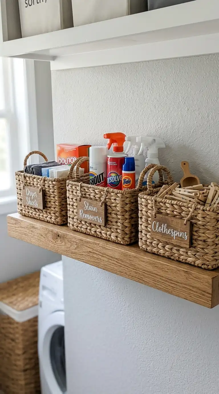 Use floating shelves and add woven or plastic baskets to corral smaller items. Label each basket for easy identification. Use one basket for dryer sheets, one for stain removers, one for clothespins, and one for miscellany. Baskets keep the shelves looking tidy.