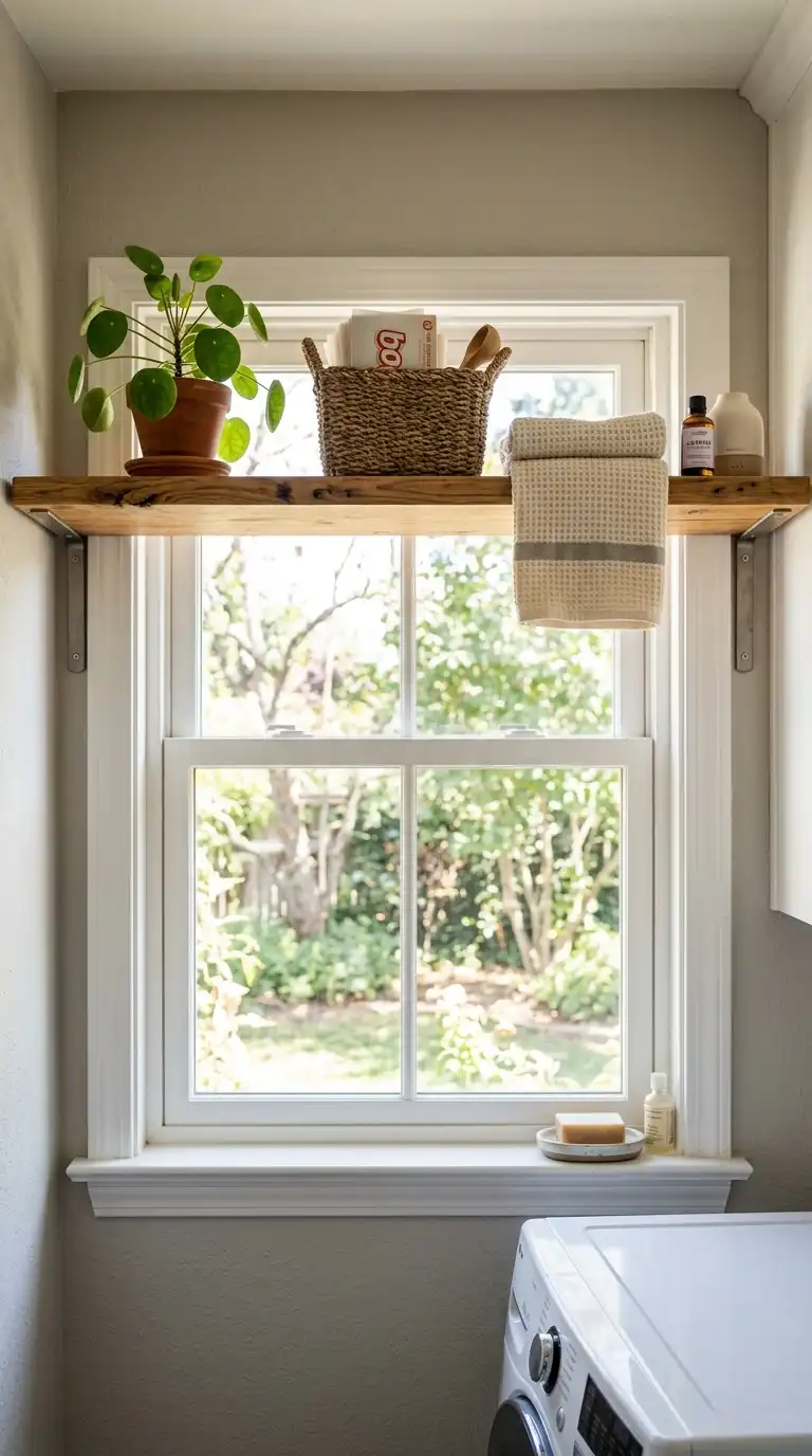 If you have a window in your laundry room, install a shelf above it. Use the shelf to store lightweight items like extra towels or baskets of supplies. This makes use of otherwise empty wall space. Keep the items decorative to maintain a pleasant view.