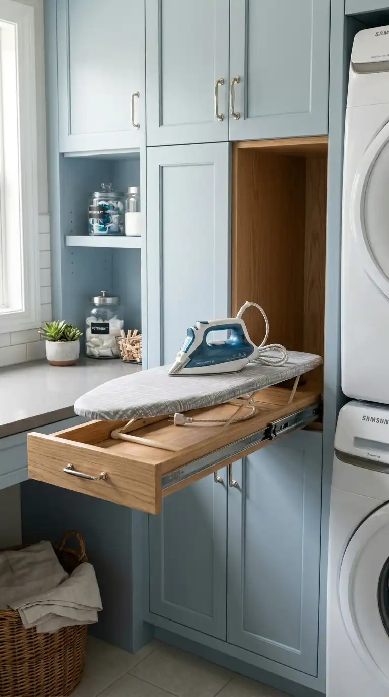 Install a narrow pull-out shelf designed to hold an ironing board. The shelf slides out when needed and tucks away when not in use. This keeps the ironing board accessible but out of sight. Some models include a built-in shelf for the iron.