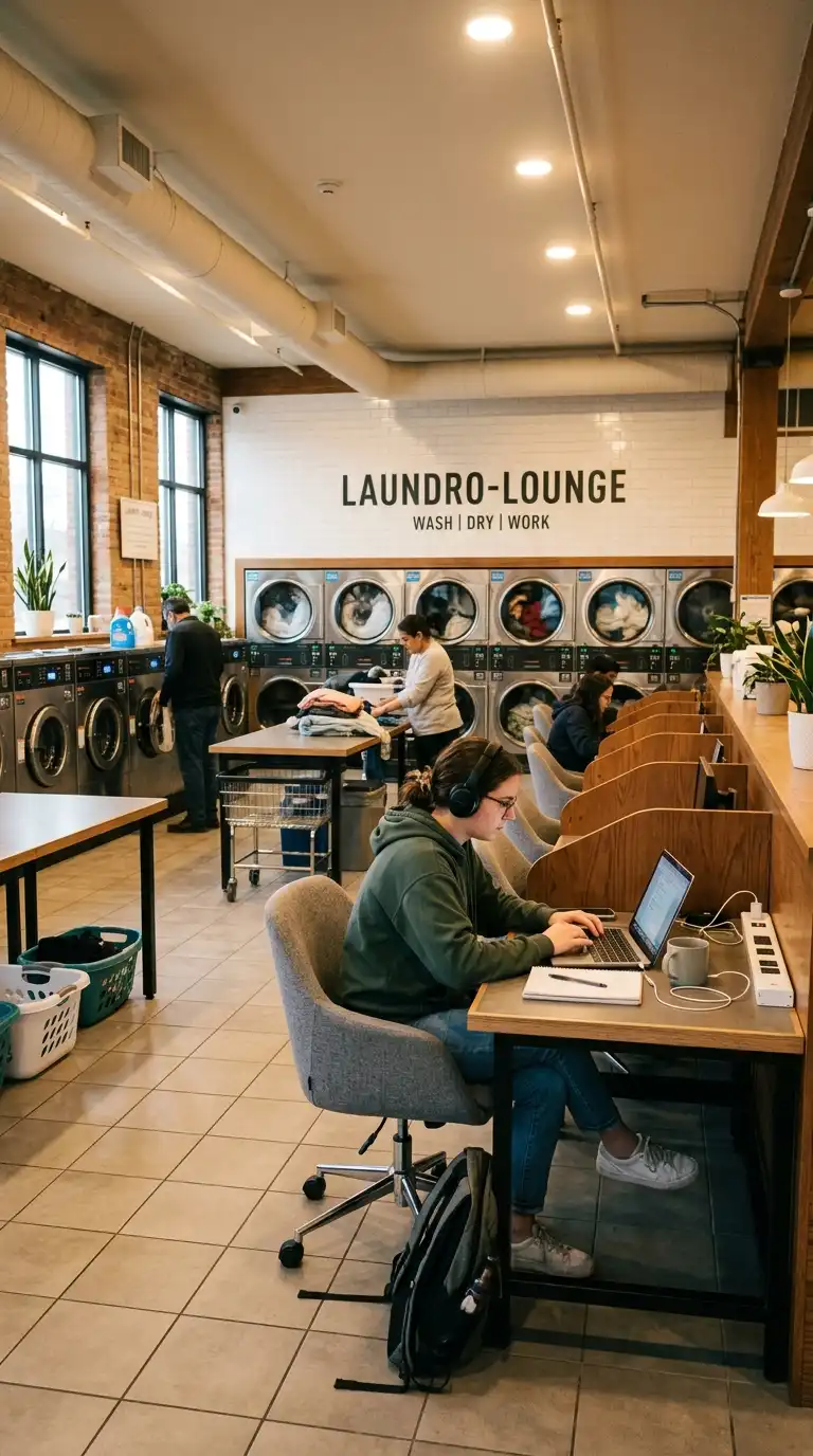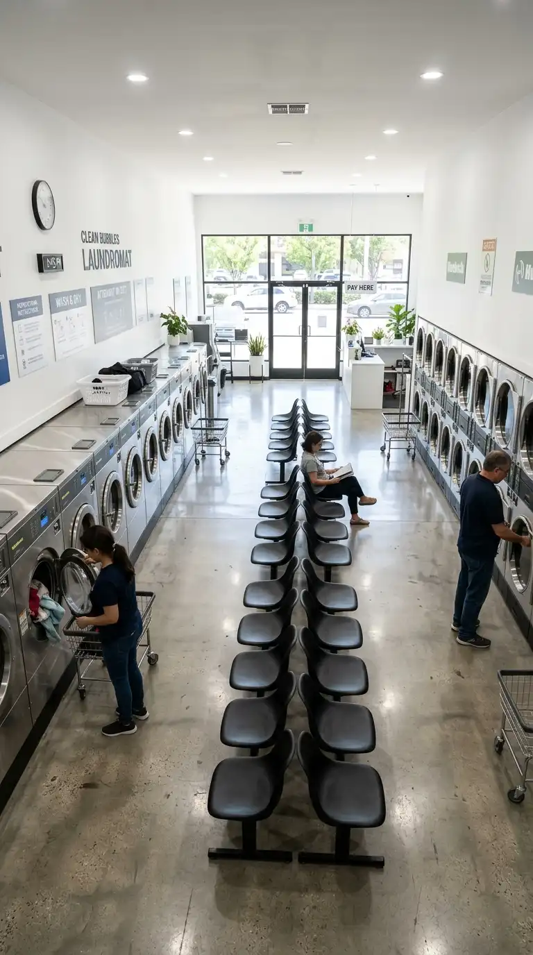 Appeal to remote workers and students by offering lounge seating and workstations. Install tables with electrical outlets and USB ports. Provide free Wi-Fi. Use comfortable chairs and good lighting. Customers can work or study while their laundry runs. This design turns the laundromat into a productive third space.