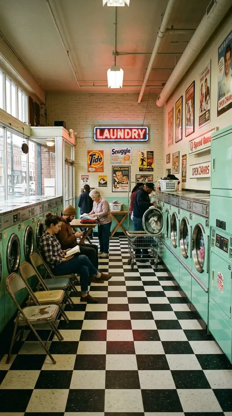A vintage-inspired laundry shop uses retro colors, old-fashioned signage, and classic machines to create a nostalgic atmosphere. Use mint green or pastel pink machines if available, or add vintage-style decals to modern machines. Use black and white checkerboard flooring, metal folding chairs, and old-fashioned pendant lights. Vintage posters and a neon “Laundry” sign complete the look.