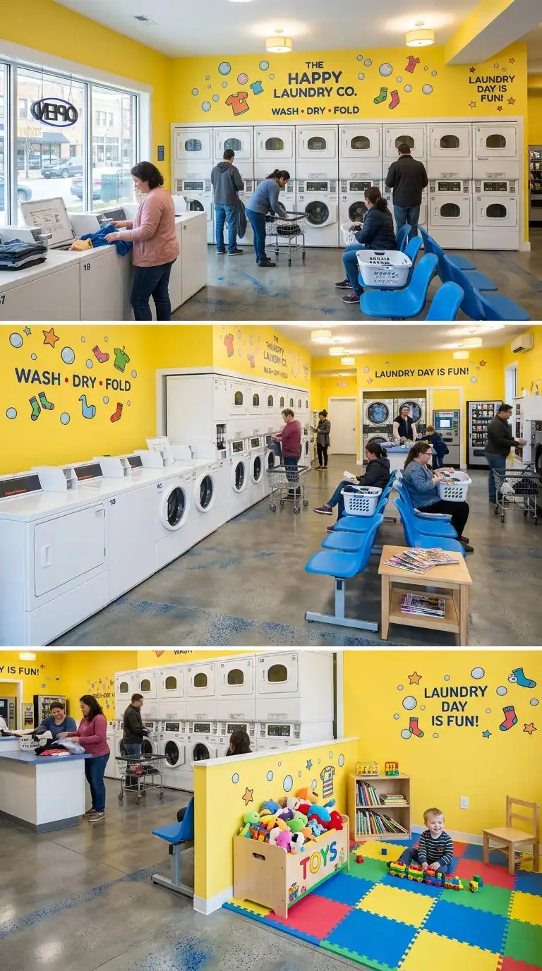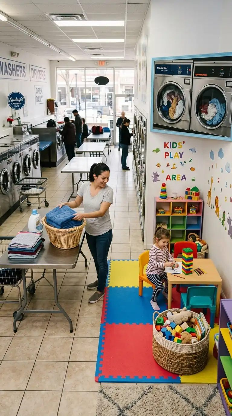 A family-focused laundromat includes a dedicated kids’ play area. Use bright colors, soft flooring, and age-appropriate toys. Add a small table and chairs for coloring. Ensure the play area is visible from the seating area so parents can supervise while folding laundry. This design makes laundry day easier for parents.